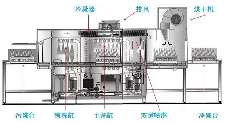 4、漂洗烘干:利用高溫凈水沖洗,使餐具表面快速干燥。